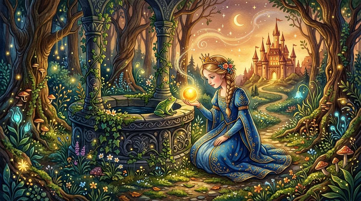 物語の舞台は、まだ魔法が日常の中に息づいていた古い時代の王国です。王様の末娘である美しい王女は、森の古い菩提樹の下にある深い泉のほとりで遊ぶのを何よりも好んでいました。