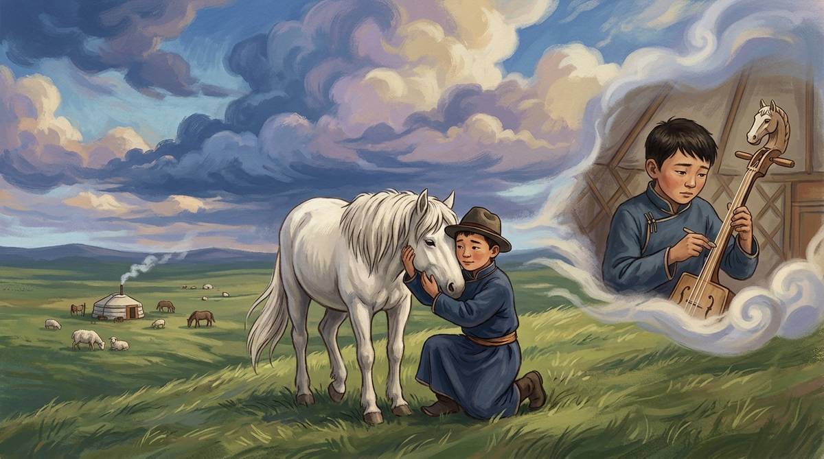スーホは白馬の願い通り、その体の一部を使って一つの楽器を作り上げました。馬の頭を彫刻し、尾の毛で弦を張り、皮を張ったその楽器こそが、モンゴルの伝統楽器「馬頭琴」の始まりとされています。